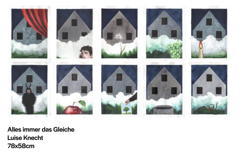 Hintergrund für eine Reflexion über Repräsentation und Macht dient: Wer darf sich auf welche Weise zeigen? Und wie verwandelt sich Selbstsicherheit in Aggression, wenn sie hinterfragt wird? Durch diese Serie begann ich, tiefer in diese Fragen einzutauchen. Ich entwickelte für mich eine neue Bildsprache durch Wiederholung, eine Sprache, die sich über kontinuierliches Hinterfragen entfaltet: Vielleicht, aber...? Jedes Bild eröffnet eine weitere Ebene der Auseinandersetzung und führt mich tiefer in den Prozess. Das Haus rückte in den Vordergrund und wachte nun über die Szenen, in denen diese neue Fragestellung ausgehandelt wird. Was als Reflexion über Macht und Dominanz begann, führte mich allmählich zu etwas, das schon immer vorhanden war, jedoch subtiler – zu dem, was ich nun den Umgang mit dem Abgrund nenne. Dieser Umgang mit dem Abgrund ist nicht dramatisch gemeint, sondern als Tatsache, als etwas, das einfach mit uns existiert. Es ist vielleicht das Gefühl, am Rand eines Brunnens zu stehen und den Boden nicht zu sehen. Oder nachts mit einer Taschenlampe in den Wald zu leuchten und zu erkennen, wie wenig sie tatsächlich erhellt. Dieses Gefühl empfinde ich weder